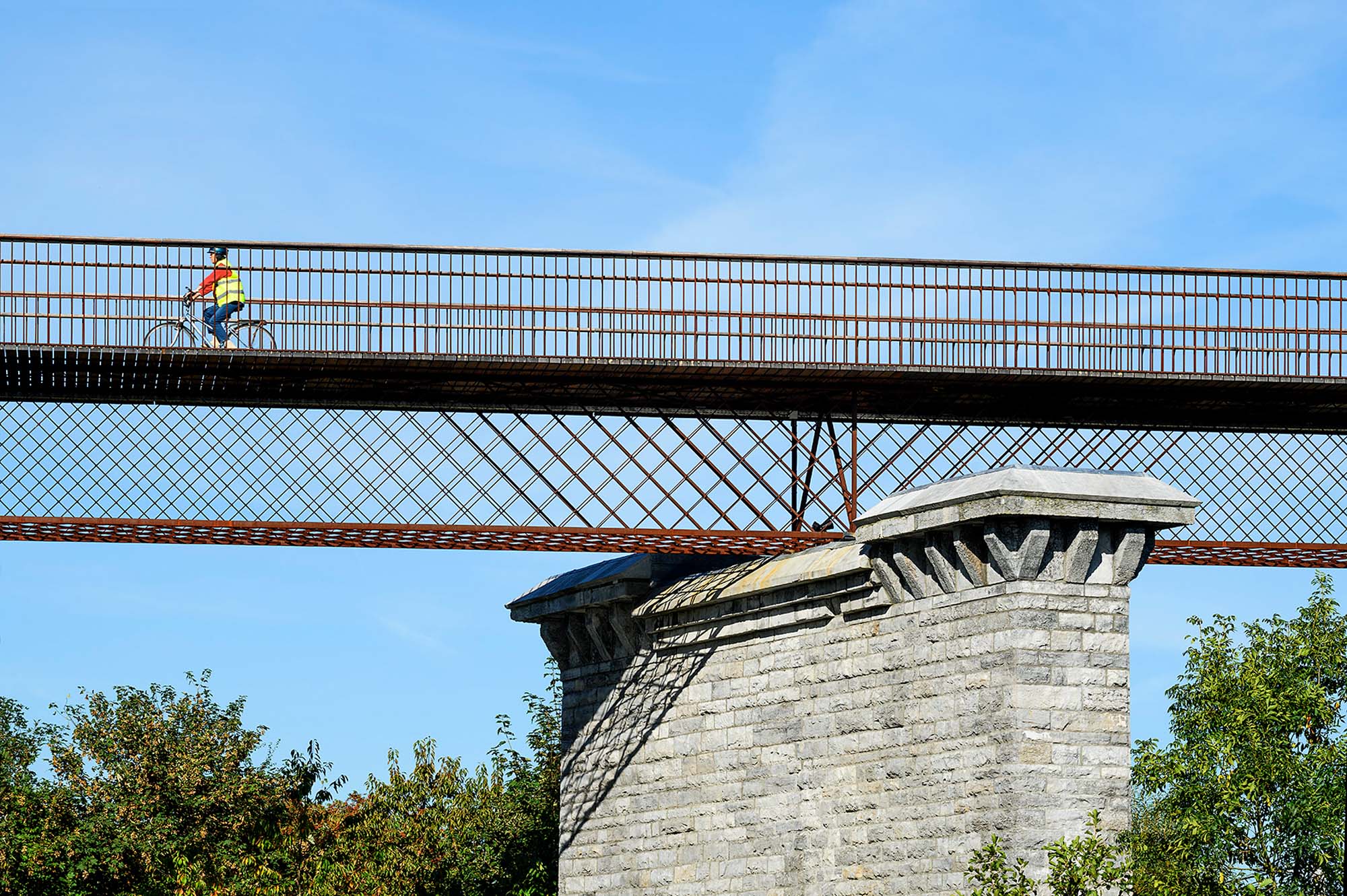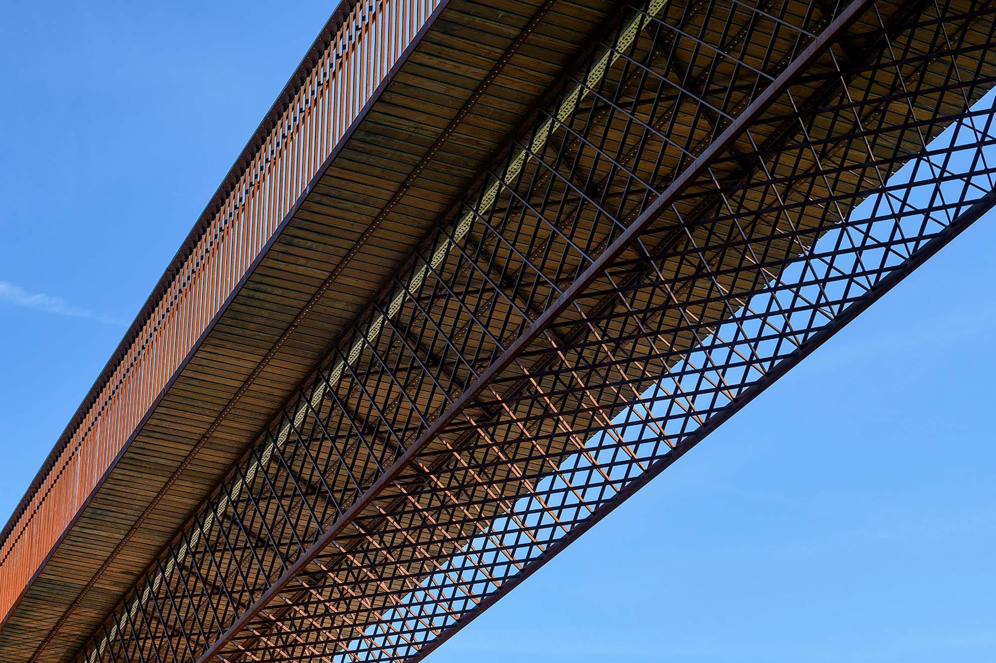 Il s’agit d’une passerelle en acier auto-patinable de 54 m de longueur composée de deux travées. Cette passerelle est installée sur des anciennes culées et pile d’un pont ferroviaire démonté après la Seconde Guerre mondiale.