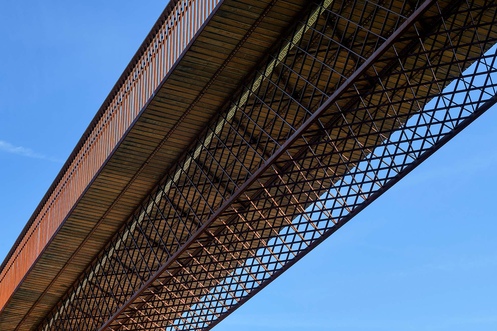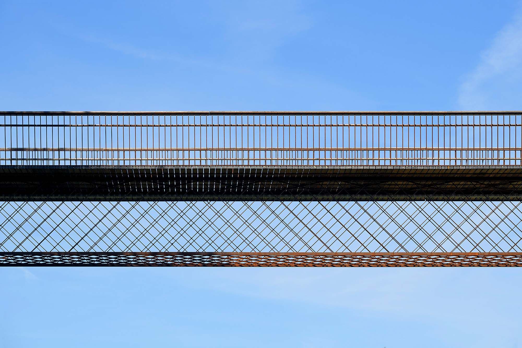 Pour rappeler le cachet de l’ancien pont, la conception de la passerelle prévoit une structure en poutre caisson dont les faces sont composées d’un treillis de barres sur des mailles à 45°. Les membrures de ce treillis sont constituées de barreaux de 80*60 mm² et les parois du ‘caisson’ sont formées d’un treillis de barres 30*12 mm² disposées tous les 35 cm. Ces barres du treillis sont soudées l’une sur l’autre à chaque croisement pour garantir leur stabilité et sont soudées en bout sur les membrures principales.