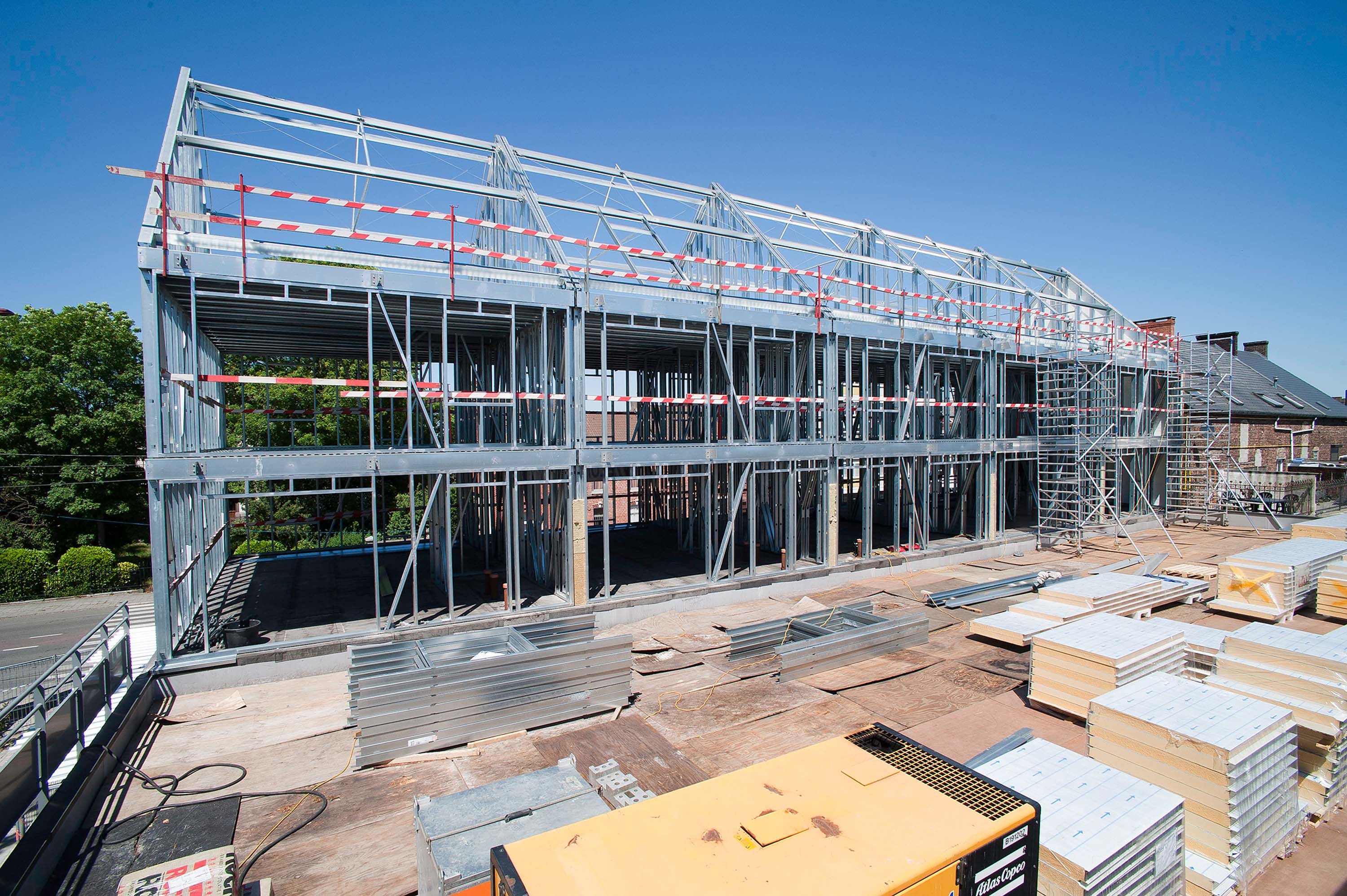 Résidence ‘Les Pasturelles’ is een ensemble van tien appartementen dat bovenop een prefabbetonnen commerciële ruimte geplaatst werd. Ze bestaat uit vijf modules van telkens twee appartementen. Deze zijn opgebouwd uit geprefabriceerde staalprofielen die op maat gesneden, geperforeerd en gegalvaniseerd werden. Aangezien de appartementen bovenop een bestaand gebouw geplaatst moesten worden, koos men voor een lichte staalstructuur die bovendien snel en eenvoudig te monteren was. Niet enkel de basisstructuur, maar ook de vloeren (bestaande uit stalen golfplaten), de sandwichpanelen in gevels en dak en de balkons zijn opgebouwd uit staal. Om de commerciële activiteiten op het gelijkvloers niet te verstoren, bevinden de ‘voordeuren’ van de appartementen, die te bereiken zijn via een stalen trap, zich aan de achterkant van het volume.