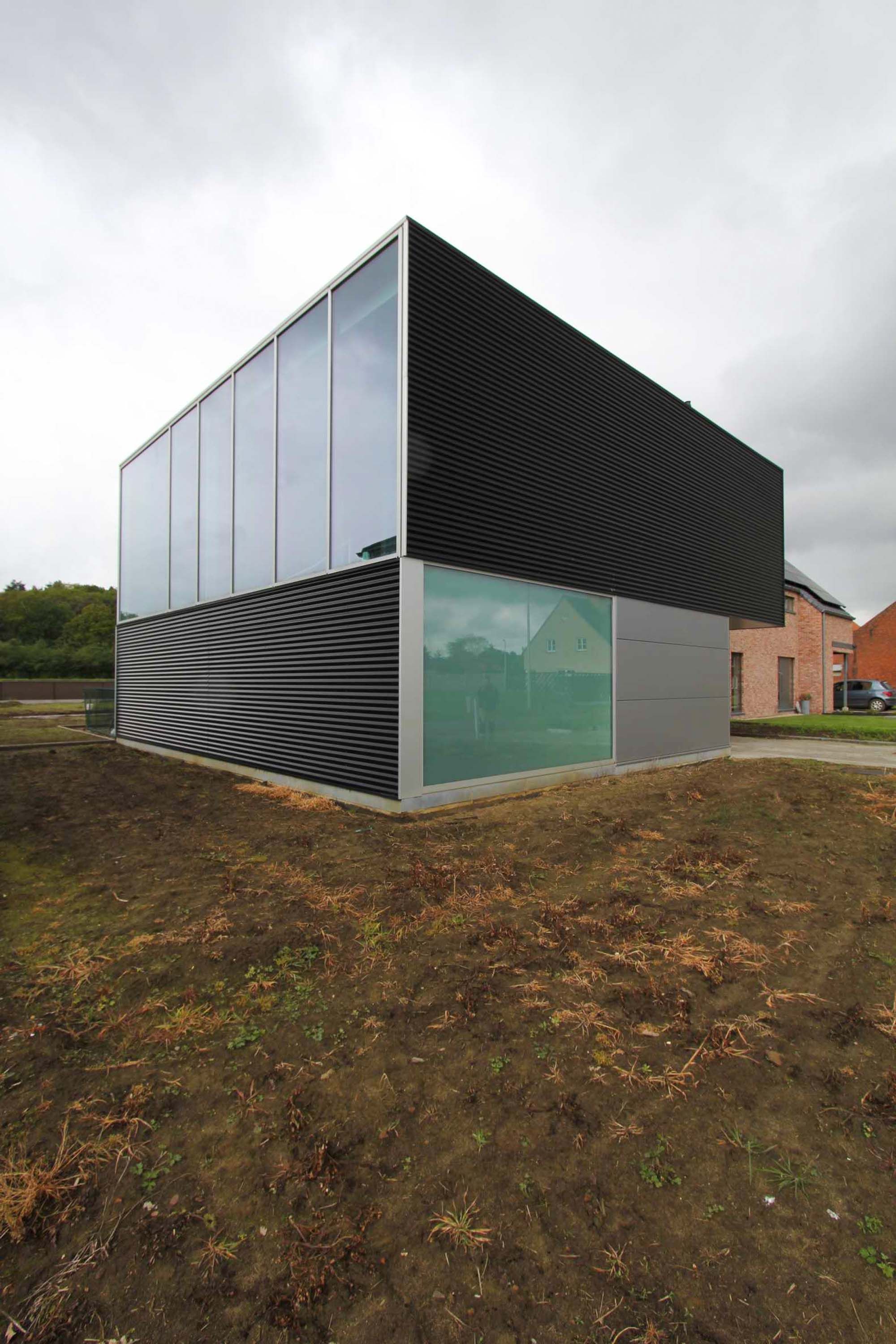 Un escalier en acier laqué en blanc, avec des marches en porte-à-faux, mène au niveau supérieur. La salle de bain et les trois chambres de l’étage sont accessibles via un hall de nuit. La conception de la maison est en soi assez sobre et fermée. L’élément le plus marquant est le porte-à-faux latéral pouvant servir de car-port intégré, et dont la stabilité est assurée par la structure primaire en acier. Cette structure est en grande partie visible à l’intérieur, ce qui explique le soin apporté aux détails.