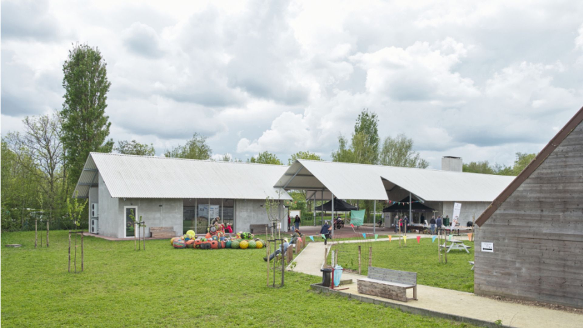 Le pavillon se compose de deux auvents en acier avec deux volumes compacts comme espaces intérieurs éducatifs. Un plan ouvert de colonnes permet de remplir de manière flexible un espace extérieur couvert. L'utilisation d'un auvent minimise la taille des espaces intérieurs et amène l'espace de circulation à l'extérieur.