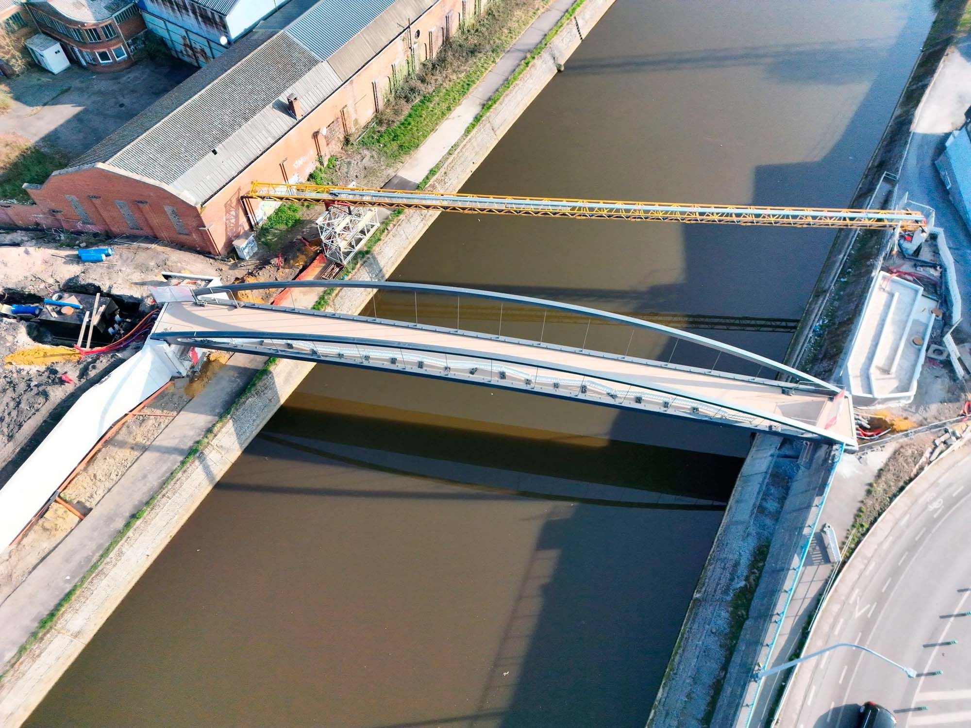 La nouvelle passerelle cyclo-piétonne sur la Sambre à Châtelet dans la province de Hainaut permet une connexion cyclo-piétonne structurante entre le centre-ville, la gare et le quartier de Châtelineau. Il permet également le franchissement de la Sambre pour de nombreux impétrants. La structure retenue est une passerelle monolithique entièrement métallique de 55 m de portée dont le tablier est suspendu à 2 arcs légèrement inclinés vers l’extérieur. Le tablier de la passerelle, de 3,7 m de largeur utile, est raidi par des entretoises transversales en T reconstituées ainsi que par des plats longitudinaux. Des percements dans les âmes des entretoises permettent d’intégrer et suspendre les nombreux impétrants. Les arcs et le tirant de la passerelle sont constitués de caissons reconstitués soudés. La forme légère et élancée de la passerelle associée à sa fréquentation piétonne, a motivée une analyse du comportement dynamique. La modélisation par éléments finis sous charge propre et piétonne (0,8 personne/m²) a permis de calculer les accélérations selon le guide du SETRA. Les résultats obtenus garantissent un niveau de confort minimum pour les piétons sans nécessité d’intégration d’un dispositif d’amortissement.