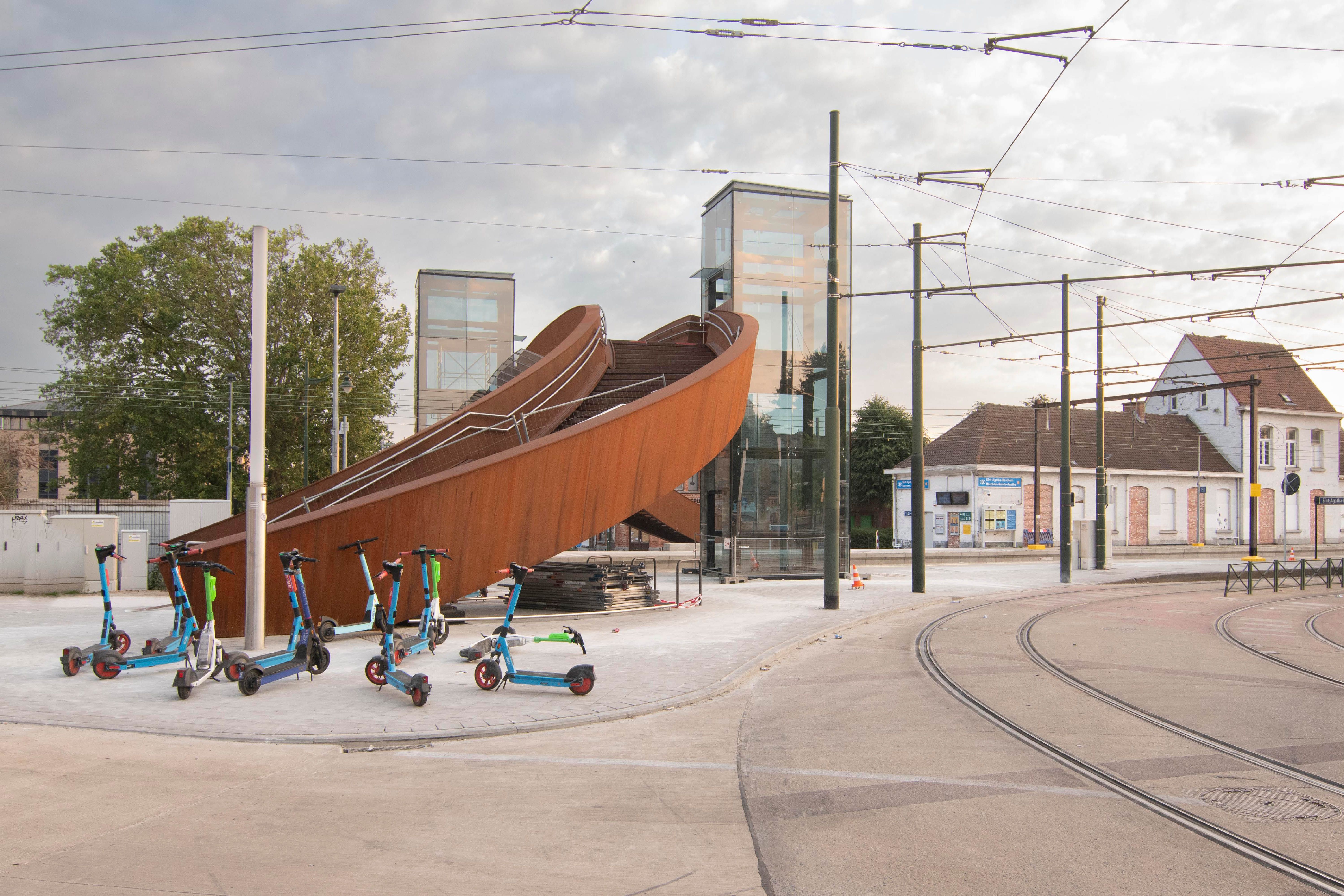 À la demande d’Infrabel, deux passerelles particulières ont été construites à Berchem-Sainte-Agathe et à Ganshoren, au nord de Bruxelles. Les deux structures enjambent la ligne L50 et permettent aux piétons et aux cyclistes de traverser les voies confortablement et en toute sécurité. Comme elles sont presque entièrement fabriquées en acier auto-patinable (‘corten’), elles apportent également une plus-value esthétique à l’environnement (sub)urbain.