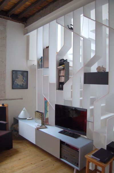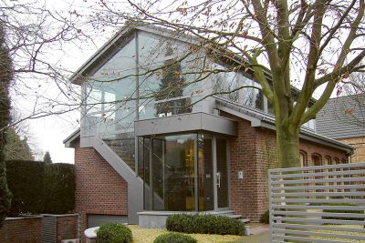 Tekst: <p>Pour l’extension de cette maison individuelle, de nouveaux escaliers ont été dessinés afin de permettre l’accès du rez au premier et au deuxième étage où une passerelle métallique relie l’extension au bâtiment existant. L’escalier est construit avec limons latéraux et supports pour marches en bois. La structure ainsi que le garde-corps sont réalisés en acier laqué, les sols des paliers et de la passerelle (ainsi que son garde-corps) sont en verre. L’acier a été choisi car il permet une construction solide d’épaisseur minimale.</p>