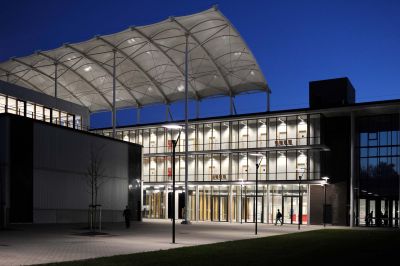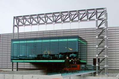 La salle multifonctionnelle peut accueillir jusque 980 personnes. Les structures existantes en béton étant irrégulières d’aspect et inaptes aux nouvelles surcharges, l’idée de l’architecte a été de les envelopper par une structure apparente de renforcement en acier. <br>