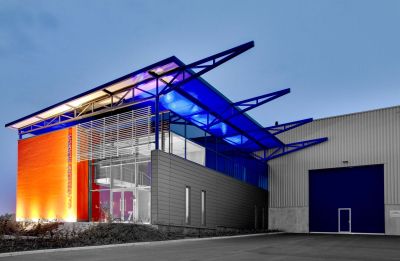 Les nouvelles installations sont constituées d'un hall de production de 1300 m² dont la structure est composée de portiques en acier S235, de deux niveaux de bureaux recourant à une structure mixte acier-béton, et d'un auvent qui s'impose comme élément marquant de l'ensemble. </p>