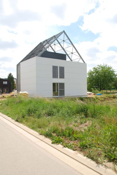 Tekst: <p>L’intérieur de la maison passive à Sint-Pieters-Leeuw est construit autour d’une séquence en spirale d’espaces qui constituent un paysage interne. La promenade passe à travers des zones plus ouvertes vers des endroits plus intimes offrant ainsi chaque fois de variantes relations, entre elles-mêmes et avec le paysage environnant.</p><p>La structure portante au-dessus du sol a été exécutée en profilés d’acier galvanisé visibles. Ces portiques portent les étages supérieurs suspendus, ce qui donne une grande liberté de conception au niveau de vie. Le squelette en acier a été totalement détaché de la peau. Les panneaux en sandwich de la construction industrielle font office d’isolation. Ils assurent un montage facile et rapide, malgré leur épaisseur de 20 cm.</p><p>Le concept osé sur le plan structurel et les techniques de construction industrielle n’empêchent pas qu’un espace intérieur tactile a pu voir le jour grâce aux matériaux naturels.</p>