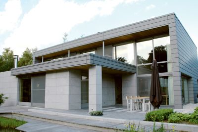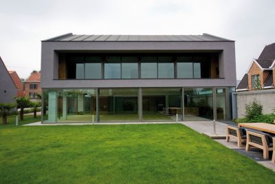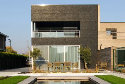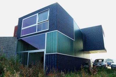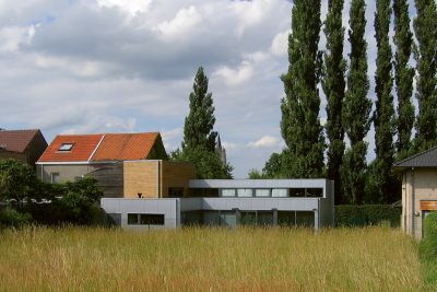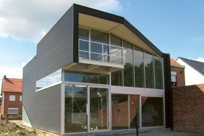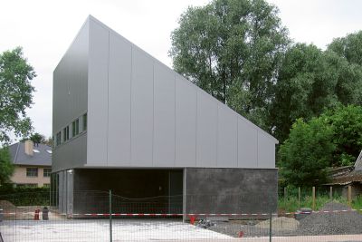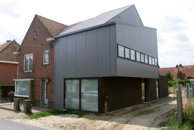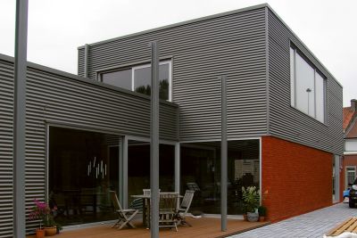 Tekst: <p>Pour rompre avec la volumétrie classique d’une habitation banale, une petite tour a été conçue et placée asymétriquement au rez-de-chaussée.</p><p>Côté ouest, un patio a été aménagé pour que la lumière du soir puisse pénétrer profondément. A l’arrière, le jardin, aménagé avec sobriété et entouré de lamelles, frappe le regard. Ces lamelles doivent conférer un sentiment de sécurité dans le paysage champêtre.</p><p>Pour souligner la verticalité de la maison, des lamelles verticales ont été choisies comme revêtement de façade. Les lamelles et les panneaux perforés sont en acier autopatinable.<br />Pour pouvoir placer l’ensemble de façade rapidement et simplement, des panneaux, qui peuvent atteindre 10 m2, ont été soudés l’un à l’autre au préalable en atelier, et accrochés d’un seul mouvement à la manière d’un portemanteau à la rive de toiture.Les lamelles de jardin sont hautes et donc soumises aux forces du vent. C’est pourquoi leurs bases ont été consolidées, les lamelles exécutées en 3 mm et l’ensemble fixé sur une console galvanisée souterraine. Les deux métaux ont été découplés avec un caoutchouc contre le courant galvanique.</p><p>De cette habitation émane une atmosphère particulière, qui contraste avec l’aspect banal du lotissement flamand.</p>