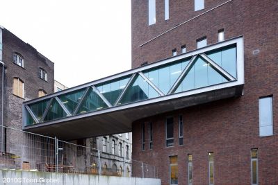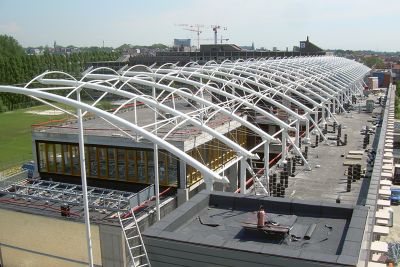 Tekst: <p>Le complexe du nouveau campus à Bruges est recouvert d’une toiture en acier monumentale qui se transforme, le long de la voie rapide, en façade avec bardage en zinc de couleur anthracite. La structure du toit est en acier afin de pouvoir franchir de grandes portées au moyen d’une construction légère. Les fermes en acier - structure en treillis - sont portées par des colonnes en béton assurant la stabilité nécessaire. La structure en acier dans son ensemble mesure 169 m de long, 50 m de large, 24 m de haut et pèse 598 tonnes. Dans la grande cage d’escalier, les poutrelles de toiture et les colonnes font office d’arêtiers, accentuant ainsi la finesse et l’ouverture de ce campus. Cette sensation d’ouverture se retrouve dans la cafétéria, où des arêtiers sont aussi utilisés. Tout le long de l’arrière du bâtiment se trouve un auvent élancé.</p>