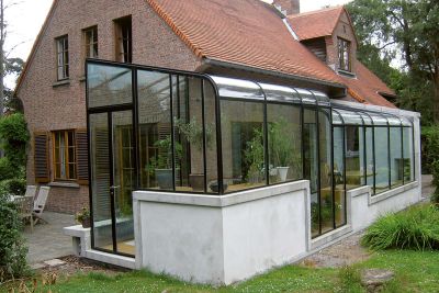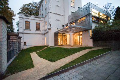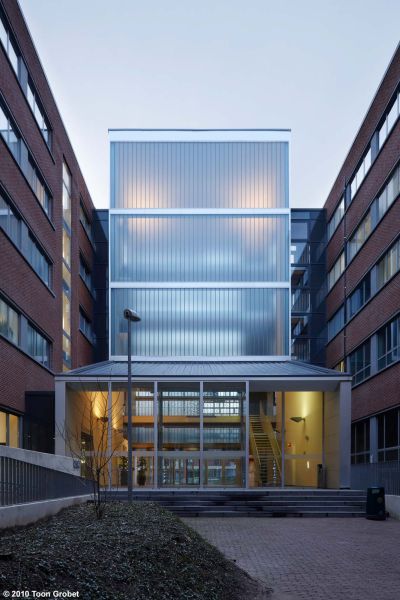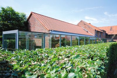 Tekst: <p>L’extension de la villa protégée Ter Beuken est un pavillon des arts dans lequel l’académie de musique, de la parole et de l’image sont rassemblées.</p><p>La passerelle, une construction légère en acier et en dalles de verre entre la villa et l’extension, relie le rez-de-chaussée surélevé de l’ancien bâtiment avec les deux étages neufs.</p><p>Dans la composition de la façade, la structure portante joue un rôle important. Les colonnes en Y élancées, très présentes sur le périmètre du volume de construction, font indissolublement partie de la structure portante.La structure minimale de la dalle de plancher et de la dalle-toiture sur des colonnes permet un contact optimal avec le parc boisé. Les colonnes tordent la corniche en acier, qui est composée de profilés en caisson. Des pièces d’accouplement spécialement conçues assurent la liaison avec les profils en acier qui se trouvent à l’intérieur de l’enveloppe isolée. L’interruption thermique nécessaire est garantie.</p>