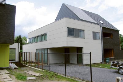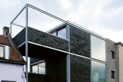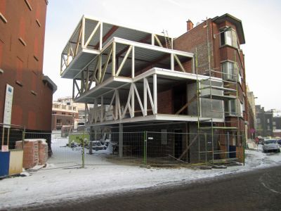 Tekst: <p>Ce projet de 4 unités de logements réparties en 2 immeubles bi-familiaux combine les avantages de l’immeuble à appartements et de la maison mitoyenne de manière à offrir aux occupants un maximum d’espace et d’intimité dans un volume compact. Celui-ci est agrémenté de grandes terrasses reposant sur une structure métallique en acier galvanisé à chaud. Les profilés verticaux, dans l’alignement des mitoyens, supportent les cadres de terrasses. Dans ces cadres sont placées des prédalles formant le coffrage perdu de la dalle de la terrasse. Le choix de l’acier pour la structure s’est imposé pour sa facilité de mise en oeuvre et sa légèreté, en opposition au volume compact de l’édifice et afin de ne pas entraver l’apport de lumière dans le bâtiment.</p>