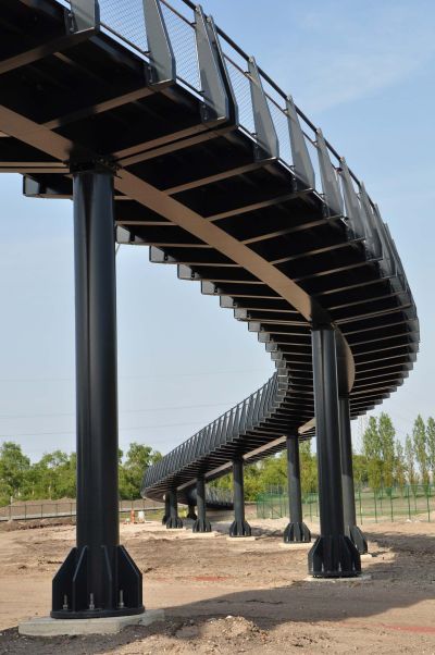 La passerelle est supportée par un profilé creux de 350 x 480 mm en forme de tire-bouchon. Ce caisson est aussi incliné d’un côté pour assurer l’évacuation de l’eau. Il est soutenu par des colonnes en acier faites de tubes ronds d’un diamètre de 508/16. Le tablier est supporté par un réseau de profils IPE 140 et de poutrelles assemblées en cône d’une hauteur allant de 480 mm à 240 mm. Le garde-corps est constitué de tôles de 10 et 15 mm. Enfin, sur ces montants sont fixés des cadres en inox avec un filet en inox.</p>