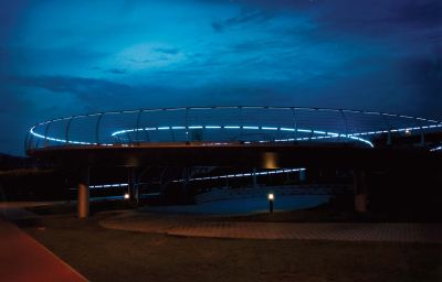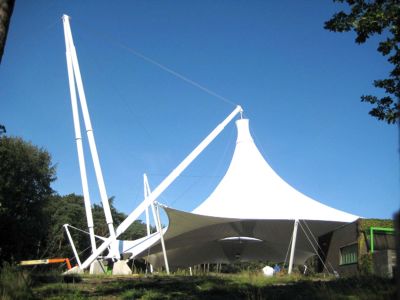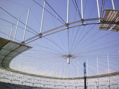 La conception et la technique de réalisation découle naturellement de la forme : un anneau structural en acier est divisé en 16 tronçons, cintrés selon un seul axe, pour la facilité d’assemblage. Un tissage de câbles d'acier, développant une ample surface gauche, est fixé sur la structure économique ainsi obtenue. Les câbles ont été placés in situ afin de garantir une tension uniforme. </p>