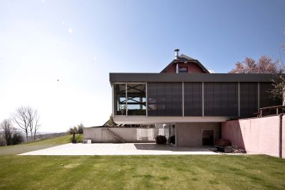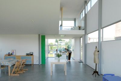Le bâtiment est constitué de deux volumes paral-lélépipédiques - le hangar et la maison - placés perpendiculairement l’un à l’autre. Ces volumes ont tous deux une structure en acier, mais se dis-tinguent visuellement par l’utilisation de matériaux différents: le hangar est habillé de panneaux de béton lisse et de polycarbonate; la maison est revê-tue de panneaux sandwich isolés de couleur noire. En contraste avec l'extérieur, l’intérieur du logement est entièrement blanc : depuis le sol coulé en polyuréthane blanc, jusqu’aux profilés des fenêtres (blancs à l’intérieur, noirs à l’extérieur), en passant par un l'escalier revêtue de Corian blanc.</p>
