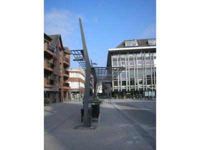 Tekst: <p>Au cœur de Louvain, les places Rector De Somer et Margaretha, proches l’une de l’autre, ont fait l’objet d’un réaménagement complet. Le trafic de transit est dévié et les deux arrêts de bus qui se trouvaient sur l’ancienne ‘place Foch’ sont séparés. Les nouveaux abribus ont une identité marquée et sont parfaitement intégrés dans leur environnement.</p><p>L’auvent à la place De Somer est constitué d’un toit incliné en verre soutenu par une structure en inox. Les colonnes supportent le toit et la cloison de verre qui fait également office de pare-vent. La baie vitrée de l’auvent se prolonge pour constituer l’une des cloisons du parking cycliste. Certaines parties de la verrière sont sérigraphiées afin de cacher des éléments techniques et structurels.</p><p>Les abribus de la place Margaretha est clairement famille de celui ci de la place De Somer: une toiture de verre porté par une structure en inox.</p>