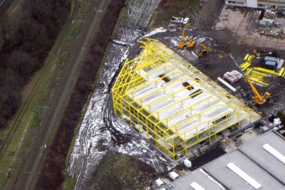 La structure en acier du hall de stockage se compose de portiques en profilés laminés type HEA 550 et IPE 600, l’espace dégagé est de 128 x 23 m au sol sur une hauteur de 14 m. <br>