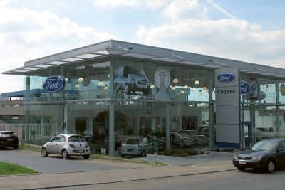 Les façades métalliques du showroom sont combinées avec un mur rideau vitré sur une structure acier. <br>