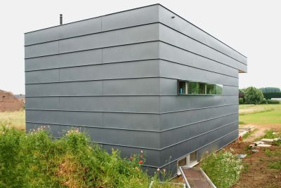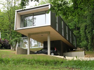 Tekst: <p>Le projet consiste en la construction d’une villa unifamiliale avec le choix d'une ossature métallique.</h1><br><p>L’implantation de la villa répond au contexte local et a la volonté de dégager une grande surface de jardin et de préserver l’intimité de ses occupants. Le volume est plié sur un axe central et couvert d’une toiture végétale à deux versants. </p><p>Les matériaux de façade sont le verre, le bois et le végétal. La maison entièrement couverte d’un bardage en bois, peint en noir. L’ossature métallique est apparue dès le départ comme une évidence au niveau de la logique structurelle du projet, de la rapidité et facilité de mise en œuvre, ainsi que pour son aspect économique.</p>