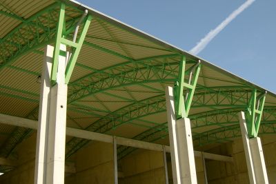 Les aciers employés sont de nuance S355. Les couvertures et les bardages des halls sont réalisés en panneaux métalliques double peau à isolation intégrée.</p>
