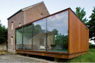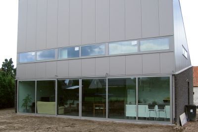 Tekst: <p>Depuis 2004, Egide Meertens a son bureau dans un bâtiment indépendant, situé derrière la maison de ses parents. Très vite, toutefois, ce bureau est devenu trop exigu et l’architecte a décidé de l’agrandir. Au-dessus du volume existant, une pièce de charpente revêtue de panneaux en béton, il a conçu un volume contrasté en zinc prépatiné qui repose par-dessus sous la forme d’une boîte détachée. Pour la structure, Meertens a opté pour le nouveau système de construction en acier de EUROSTEEL framing, placé par Thijs Industriebouw.</p><p>Le nouveau volume s’articule sur le volume existant avec un porte-à-faux de plusieurs mètres. L’arrière est complètement occupé par un grand vitrage qui offre une vue magnifique sur le paysage hesbignon sous-jacent. On obtient ainsi une directivité sur le paysage.</p>