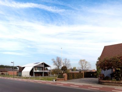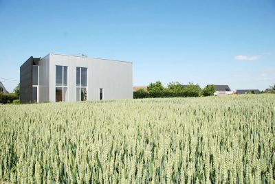 Tekst: <p>Ce bâtiment industriel avec logement est unique par sa situation : la parcelle était le dernier lot inoccupé d’une zone de PME qui borde à la fois une zone agricole et une zone résidentielle. Le hangar a logiquement été implanté du côté de la zone de PME, alors que la maison et les bureaux sont adjacents à la zone résidentielle. De cette manière, la maison bénéficie en plus d’une orientation sud et de la vue sur les champs.<br>