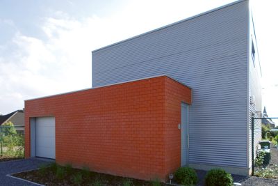 Tekst: <p>Cette maison, située dans le canton de Grevenmacher, s’ouvre avec son pignon vitré vers une grande terrasse et un accueillant jardin, situés parallèlement à la rue. Le maître d’ouvrage souhaitait une solution ‘douce’ comme paravent, c’est-à-dire une solution qui permettrait de conserver l’intimité privée entre la terrasse et la rue, mais sans donner l’aspect d’un mur séparatif austère et froid.<br>Le bureau d’architecture WeB a donc eu l’idée de réaliser un rideau en lamelles verticales avec une simple structure en acier, composée de 126 profilés en L (100 x 50 x 6 mm), laqués en couleur DB 703, d’une hauteur de 3 m. Sur une longueur d’environ 9,5 m, six éléments identiques et une double porte forment le paravent. Les six éléments sont miroités et tournés, ce qui donne un aspect et une forme légèrement ondulée. L’idée d’un rideau en acier est renforcée par les interstices variés qui laissent filtrer les rayons de soleil sur la terrasse. Les jeux d’ombre et de lumière donnent alors l’impression d’un voile flottant.</p>