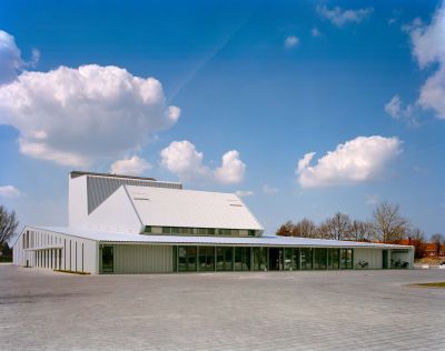 Tekst: <p>Le crématorium de Hofheide, près d’Aarschot, est érigé dans une vaste pièce d’eau dans un coin de nature vierge du Hageland. Le terrain se situe entre le côté nord et le côté sud de la chaîne de collines.</p><p>Les architectes voulaient créer une architecture apparentée à un reliquaire; un bâtiment conçu comme un sarcophage. L’objectif était de donner à l’ensemble un caractère sacré sans évoquer une religion spécifique. La lumière, l’ambiance et l’eau joue un rôle important. Le bâtiment est très fermé et émane par la lumière indirecte une ambiance intime.</p><p>Sur tout le pourtour de la grande construction massive, un auvent en acier a été suspendu, pour la protéger comme un sarcophage. L’auvent est constitué de bandes d’acier auto-patinable, fixées l’une à l’autre et torsadées pour procurer une rigidité suffisante.</p><p>La menuiserie extérieure est aussi en acier auto-patinable qui s’intègre avec le volume massif et l’environnement avec sa belle couleur rouille.</p><p>Au crématorium d’Hofheide l’on peut faire ses adieux de manière formelle et sereine aux défunts que l’on peut quitter l’âme en paix.</p>