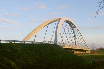 Tekst: <p>Le pont ‘De Oversteek’ relie Nimègue-Ouest au nouveau quartier De Waalsprong, une extension de la ville sur la rive nord. Il comprend quatre bandes de circulation et une bande d’arrêt d’urgence. Du côté de la ville, une piste de quatre mètres de large a été créée pour les cyclistes et les piétons.</p><p>La longueur totale du pont est de 1.195m, rampes comprises. La construction en acier de 285 mètres pour la travée principale est le plus grand pont à un seul arc d’Europe. Grâce à cette construction ce n’est pas seulement le chenal de navigation, mais tout le fleuve qui est franchi.</p><p>La construction en arc rappelle le style de l’ancien pont sur le Waal. La maçonnerie traditionnelle avec des briques sur les côtés des travées d’accès se éfère à Nimègue en tant que ville et donne au pont un caractère urbain. En utilisant les forces transmises par l’arc, on peut construire un pont avec un minimum d’acier. En raison de la minceur du pont, de son esthétique et des exigences de la sécurité incendie, c’est un acier de grande qualité qui a été choisi. </p>