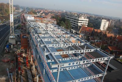 Tekst: <p>Ce bâtiment de bureaux de 8 500 m² est destinéà l’extension des bureaux d’études de CMI Cockerill Maintenance & Ingénierie, logés actuellement dans le château de Seraing.</p><p>La structure est presque exclusivement constituée de poutres et de colonnes métalliques avec planchers en hourdis en béton précontraint et noyaux rigides en béton armé et post contraint.</p><p>L’ouvrage présente un important porte-à-faux dont la superficie totale de près de 2 000 m² est réparti sur trois niveaux. Il est composé de quatre poutres treillis de 25 à 35 m de portée s’appuyant l’une sur l’autre et dont la principale s’encastre dans un imposant voile-console en béton post contraint reposant directement sur le lit rocheux à dix mètres de profondeur. 350 tonnes d’acier S355 et S460 ont été nécessaires pour la construction de l’ouvrage, dont 150 tonnes pour les seules quatre poutres treillis du porte-à-faux. Ces dernières ont été réalisées entièrement en atelier, acheminées via la Meuse toute proche et montées sur chantier en quelques jours.</p>