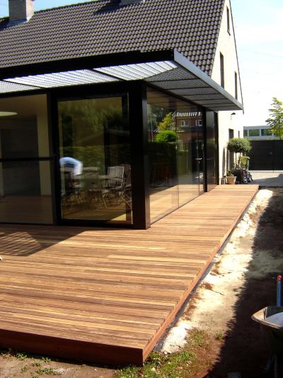 Tekst: <p>La nouvelle terrasse est construite en porte-à-faux, au-dessus de l’entrée de garage. La structure est constituée d’une plateforme en poutres laminées reposant d’un côté sur 2 piliers en acier et fixée de l’autre côté sous la dalle du rez-de-chaussée. Entièrement réalisée en acier galvanisé en raison de sa légèreté et de ses qualités structurelles et anticorrosives, la terrasse est bordée d’un garde-corps en matériel composé ornementé reprenant l’aspect métallique de l’ensemble.</p>