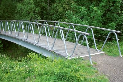 Une simple tôle d’acier de forte épaisseur a été découpée en dents de scie pour former, sans perte de matière, deux parties identiques destinées à former les âmes des deux poutres latérales. La par-tie inférieure des tôles ‘évidées’ est repliée à angle droit pour former la surface d'appui du platelage en bois, qui y est fixé par simple boulonnage.</p>