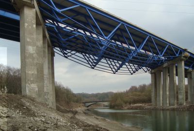Les pieux de fondation du nouveau pont font face au pont existant. Les travées sont variables et vont jusqu’à 74 m. Il s’agit d’une structure mixte béton-acier. Le tablier en béton armé repose directement sur deux poutres caissons en acier. Les haubans déchargent ces poutres et en font une structure très ouverte. <br>