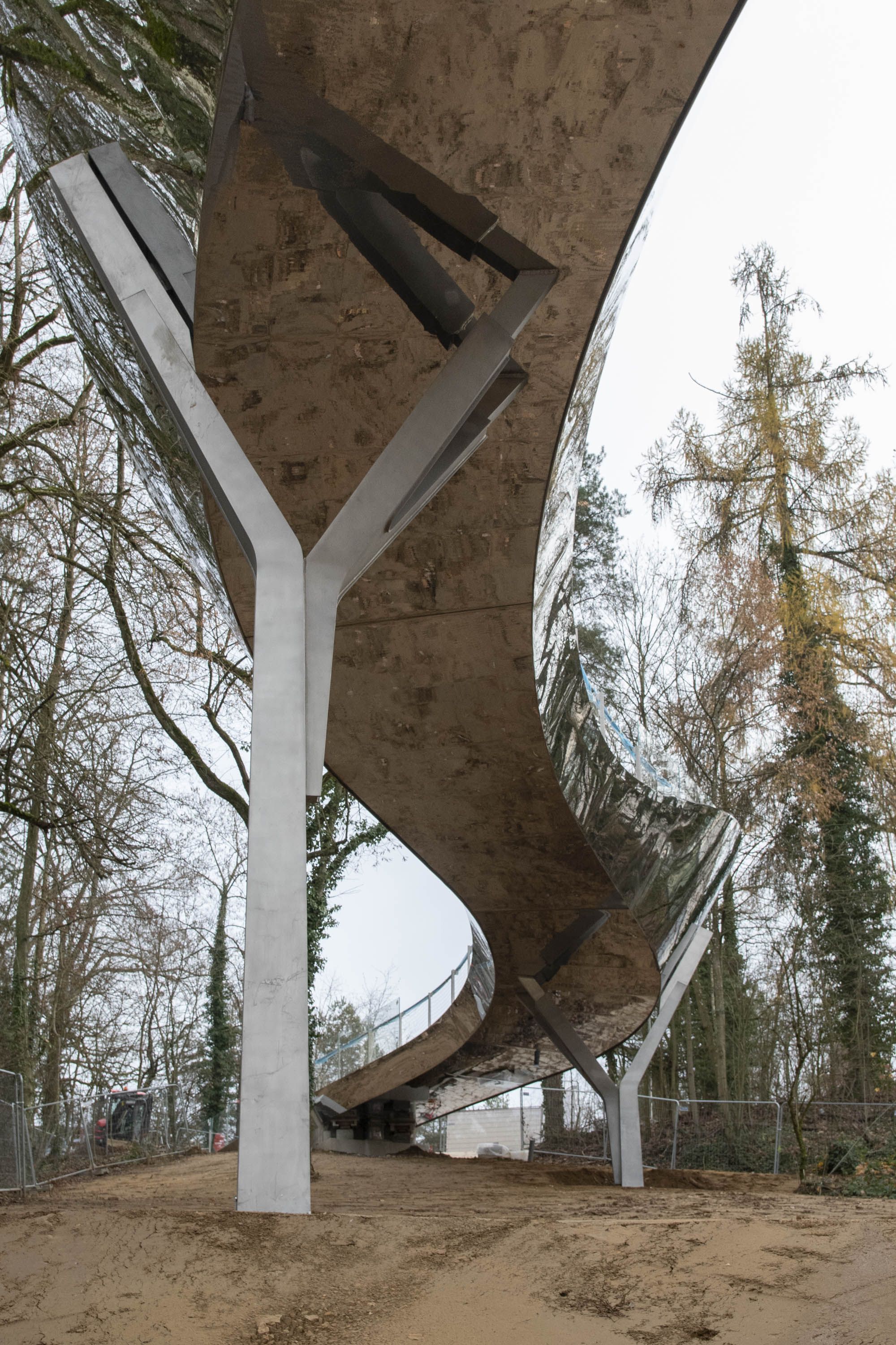 L’implantation de l’ouvrage en plan et élévation est prévue pour préserver un maximum d’arbres existants. Le nombre limité de piles a permis de réduire l’impact au sol de l’ouvrage sur la forêt et dans la clairière.