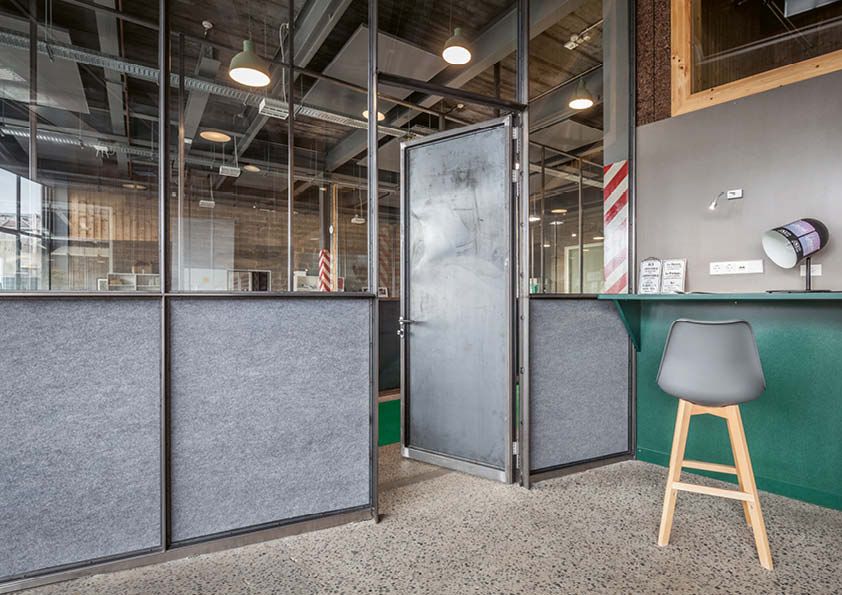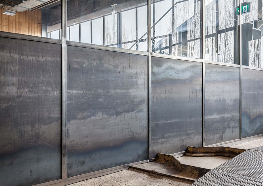 Een grote werkruimte werd in tweeën gedeeld zonder het open karakter van het geheel aan te tasten of de ruimte donkerder te maken. De wanden begrenzen de nieuwe ruimtes zonder ze akoestisch te scheiden, aangezien ze niet de volledige plafondhoogte bestrijken. Ze zijn samengesteld uit een gesloten onderste deel en een beglaasd bovenste deel, conform de afmetingen en hoogtes van de bestaande ramen van deze voormalige ARBED-ateliers. Alle profielen zijn gemaakt van onbehandeld ruwstaal, terwijl de opvulplaat uit zwart staal bestaat. De binnenzijde van de platen is bekleed met lichtgrijs vilt om de akoestiek in de werkruimtes te verbeteren. De staalconstructie is geprefabriceerd en de beglazing is in slechts drie weken tijd geplaatst, wat op de werf zelf gebeurde. Door onbehandeld ruwstaal te gebruiken en de glaslatten vast te schroeven, kunnen het glas en de staalprofielen later gemakkelijk gescheiden worden en kan de hele constructie opnieuw gebruikt worden.