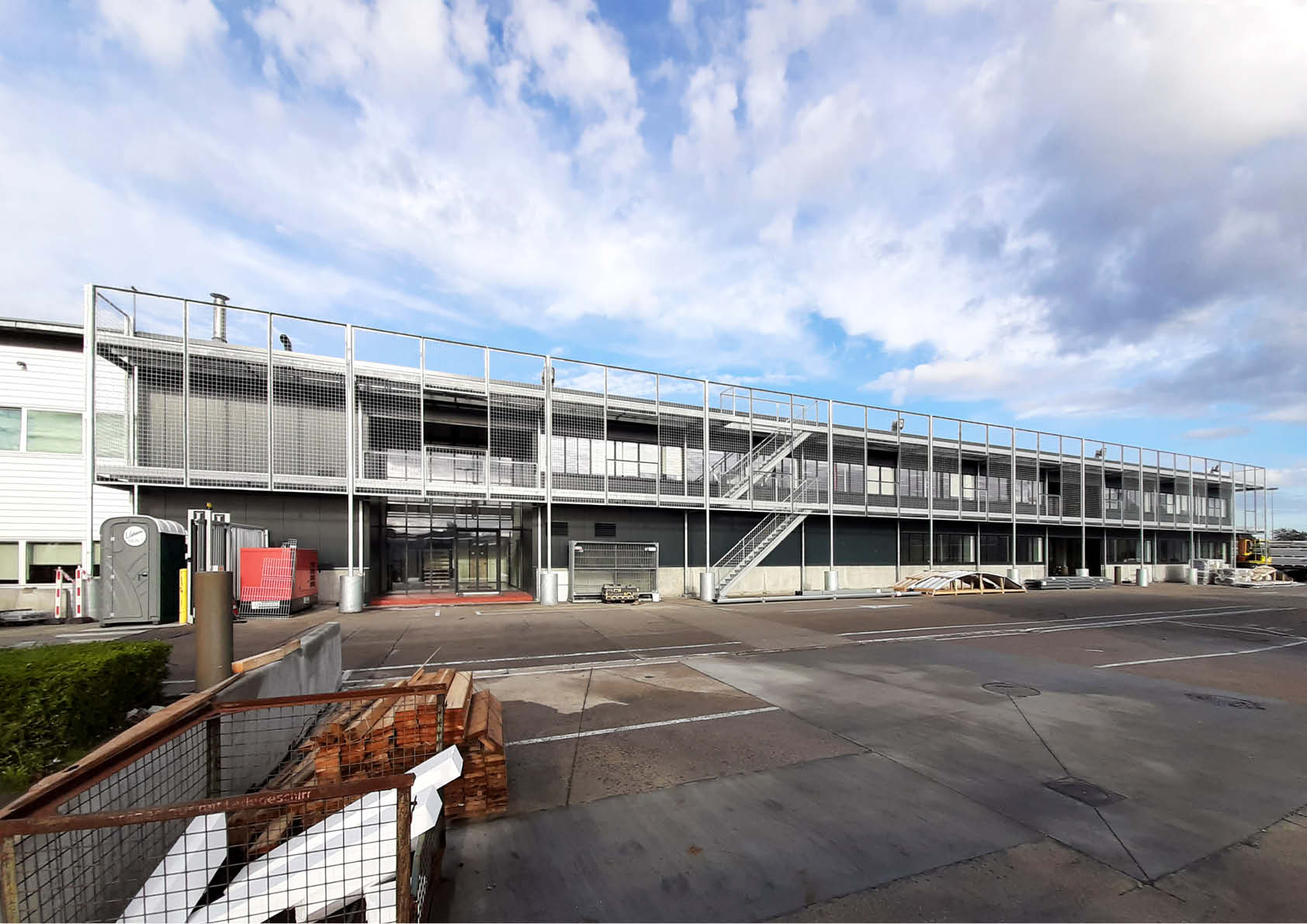 Gezien de nood aan bijkomende kantoorruimte (op de verdieping) en nieuwe sociale lokalen (op het gelijkvloers) werd deze voormalige loods verbouwd volgens het box-in-boxprincipe. Vermits het bedrijf in kwestie zelf producent is van staalproducten, werd er qua draagstructuur geopteerd voor een lichte, ter plaatse geproduceerde steelframeconstructie.