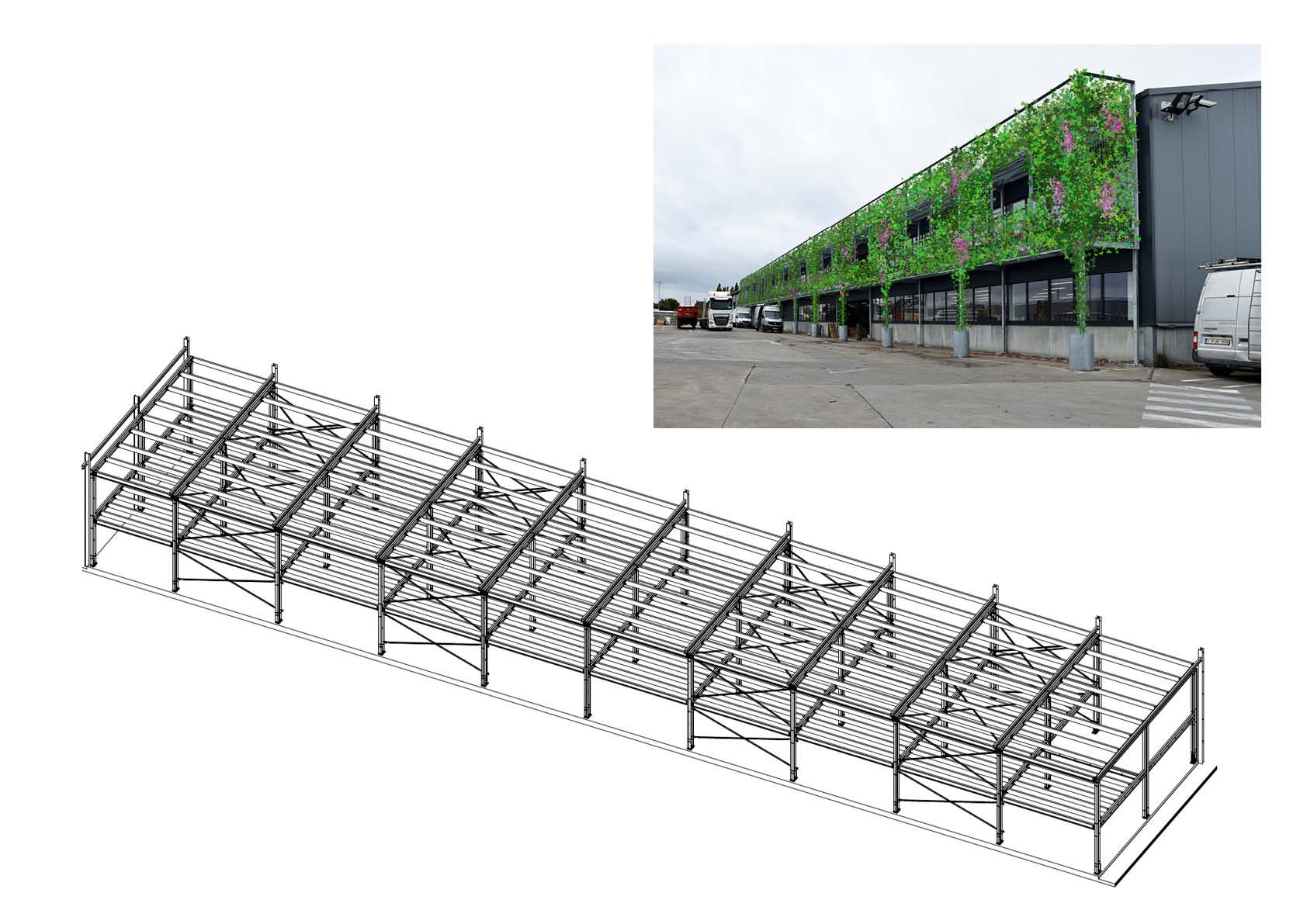 De verdiepingsvloer bestaat uit mezzanineplaten, die bekleed zijn met tapijttegels. Het dak is samengesteld uit steeldeck en rotswolisolatie. De zuidgevel is bekleed met sandwichplaten. Deze laatste zijn bevestigd op horizontale, koudgewalste gordingprofielen, waaraan ook het schrijnwerk is bevestigd. Daarvoor is een transparante, gegalvaniseerde constructie geplaatst. Deze begroende buitenstructuur is opgebouwd uit lichte profielen en vloerroosters, net zoals de vluchttrappen. De klimplanten zullen zich gaandeweg over de volledige gevel verspreiden via gegalvaniseerde wapeningsnetten met grote openingen.