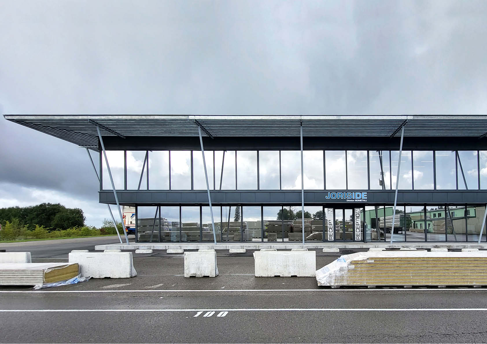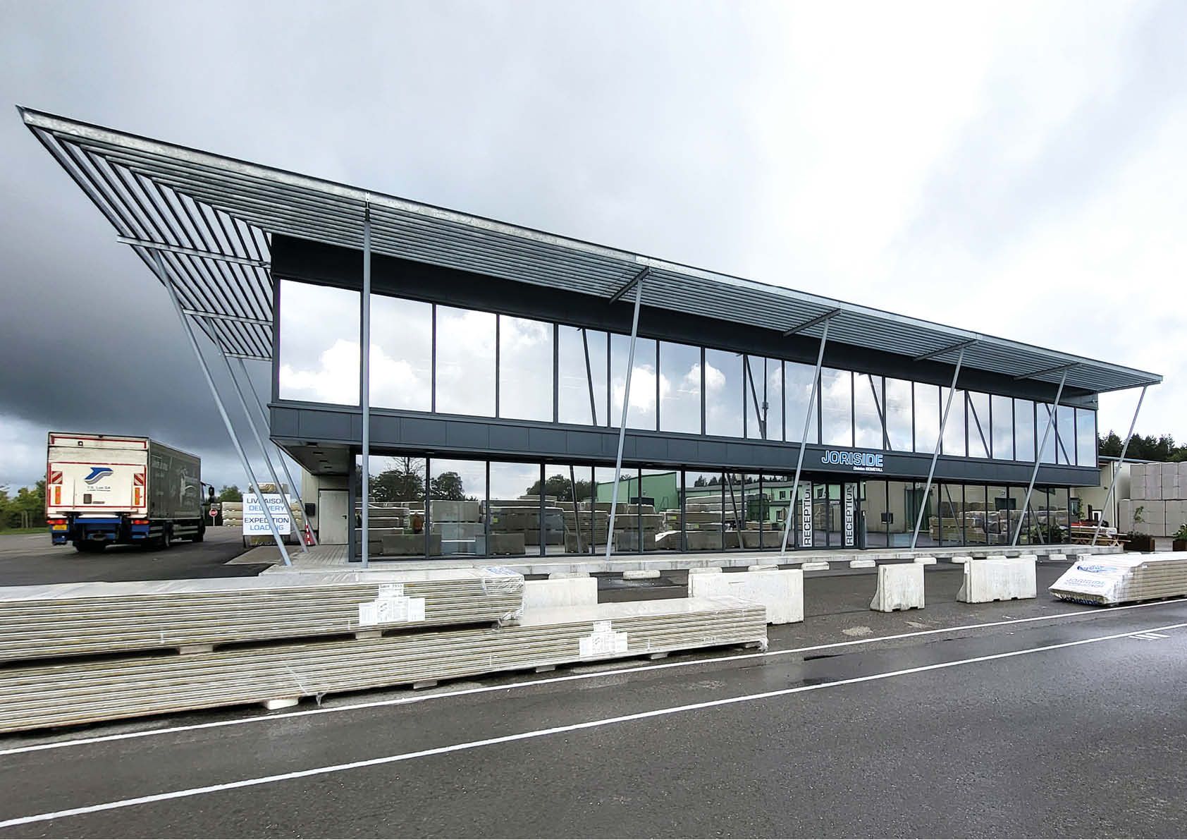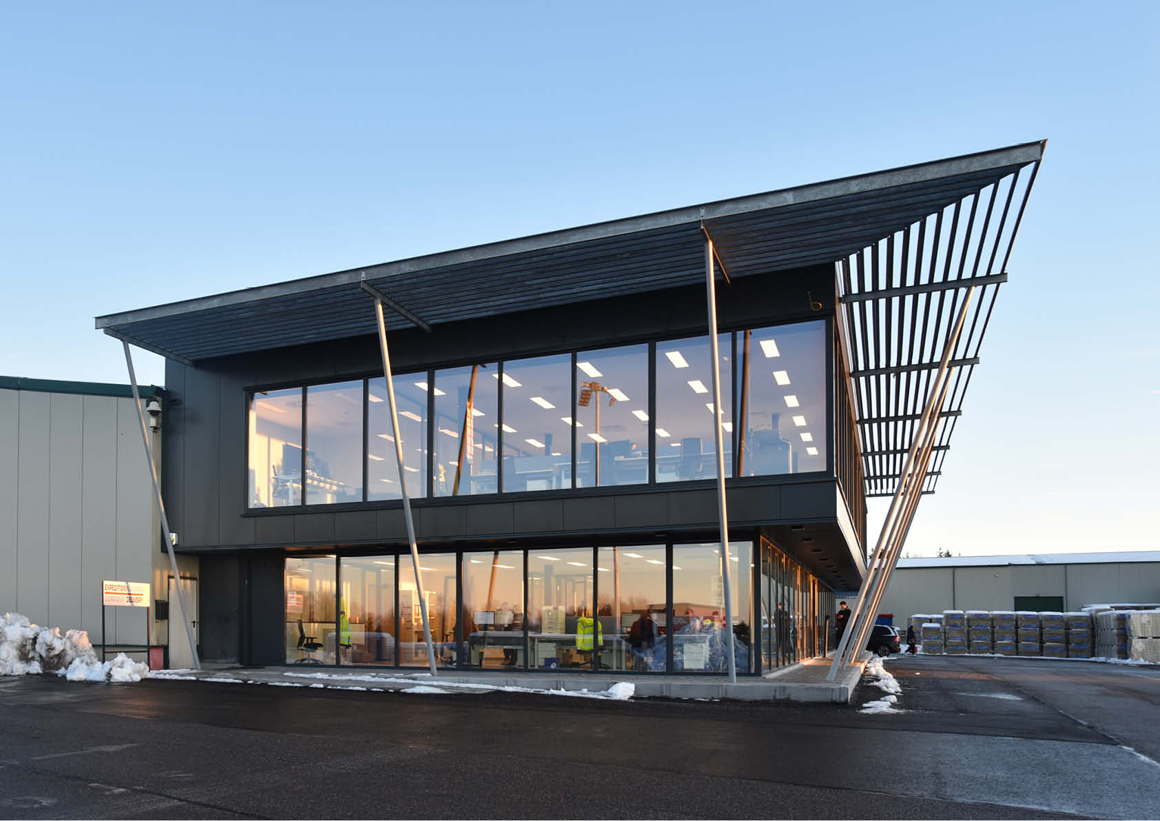 Op een industriële site in het hart van de Ardennen werd een nieuw kantoorgebouw opgetrokken, ter vervanging van verouderde kantoren die zich in een loods bevonden. Aangezien een goed overzicht er cruciaal is, is het gebouw volledig omzoomd met glas. Vandaar de nood aan een vaste zonwering in de vorm van een gegalvaniseerde structuur die de zonweringslamellen voor het overkragende verdiepingsgedeelte draagt.