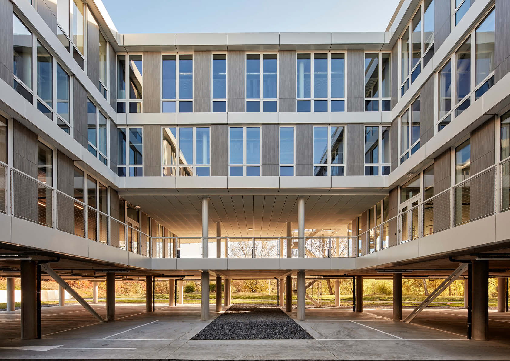Ook aan de buitenkant van het ORES-gebouw speelt staal een prominente rol, meer bepaald in de vorm van uitkragingen, terrassen met zichtbare kolommen en luifels in strekmetaal. Dankzij zijn vooruitstrevende ontwerp, modulariteit en aanpasbaarheid symboliseert het ORES-hoofdkantoor de voortdurende transformatie van het bedrijf.