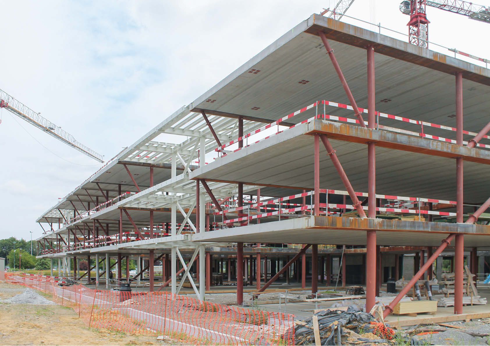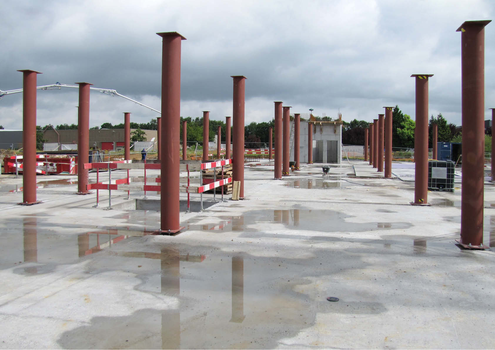 Zo is ook stalen kolomstructuur is relatief gemakkelijk te demonteren. Om grote overspanningen van 11 m te kunnen realiseren, werden de stalen buizen met een diameter van 355 mm (begane grond) en 273 mm (eerste en tweede verdieping) gebruikt als kolommen, opgevuld met beton. Deze kolommen dragen stalen I-profielen die zijn ingebed in de vloerplaten.