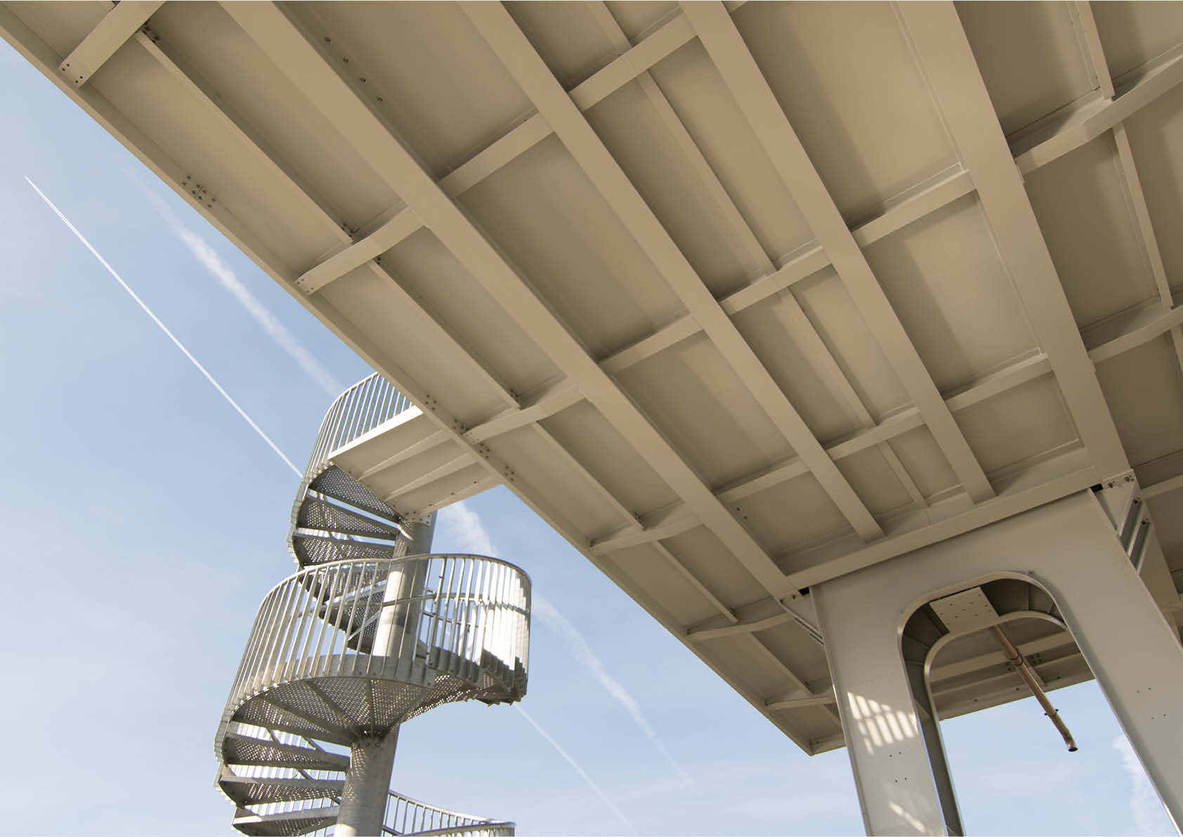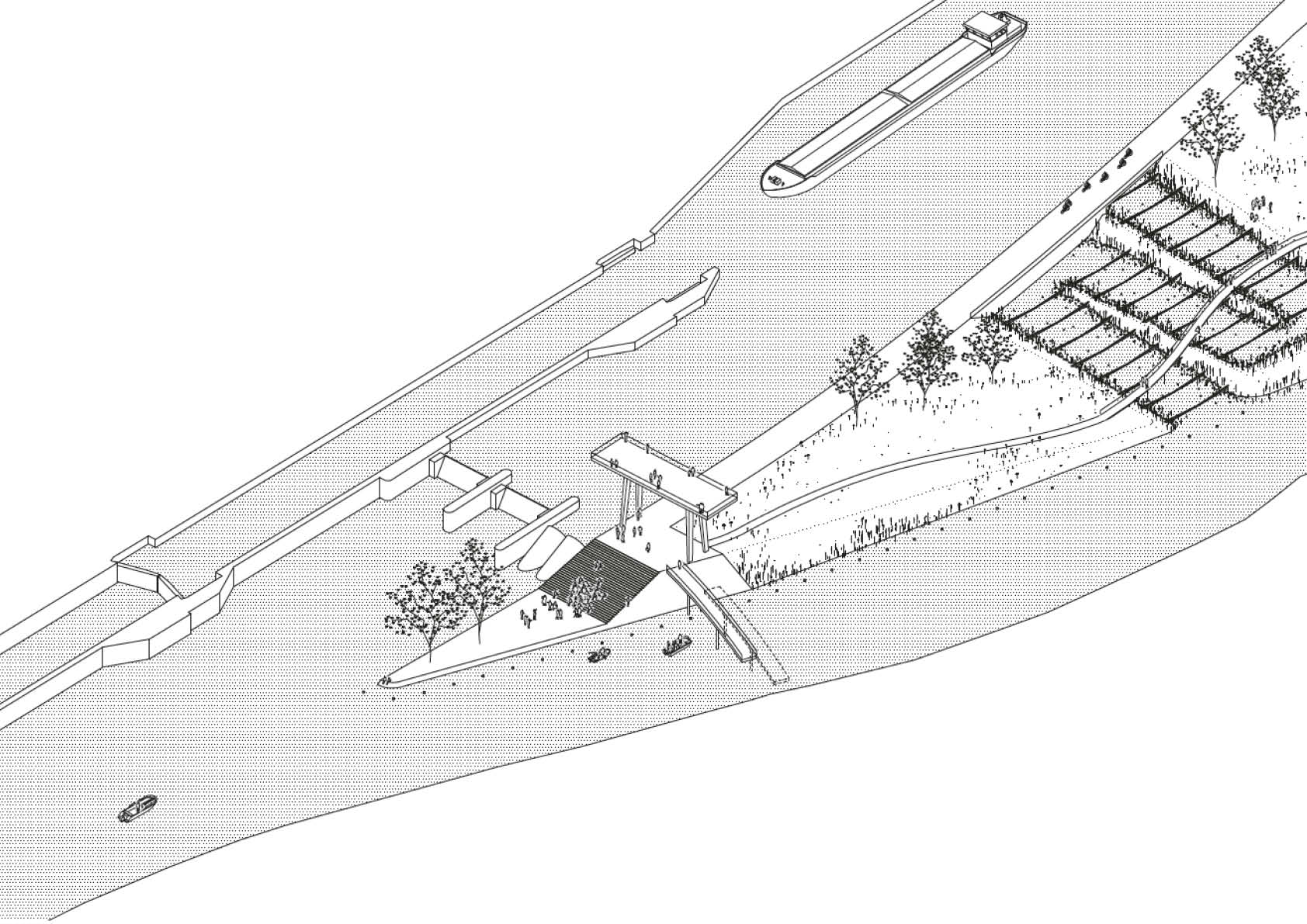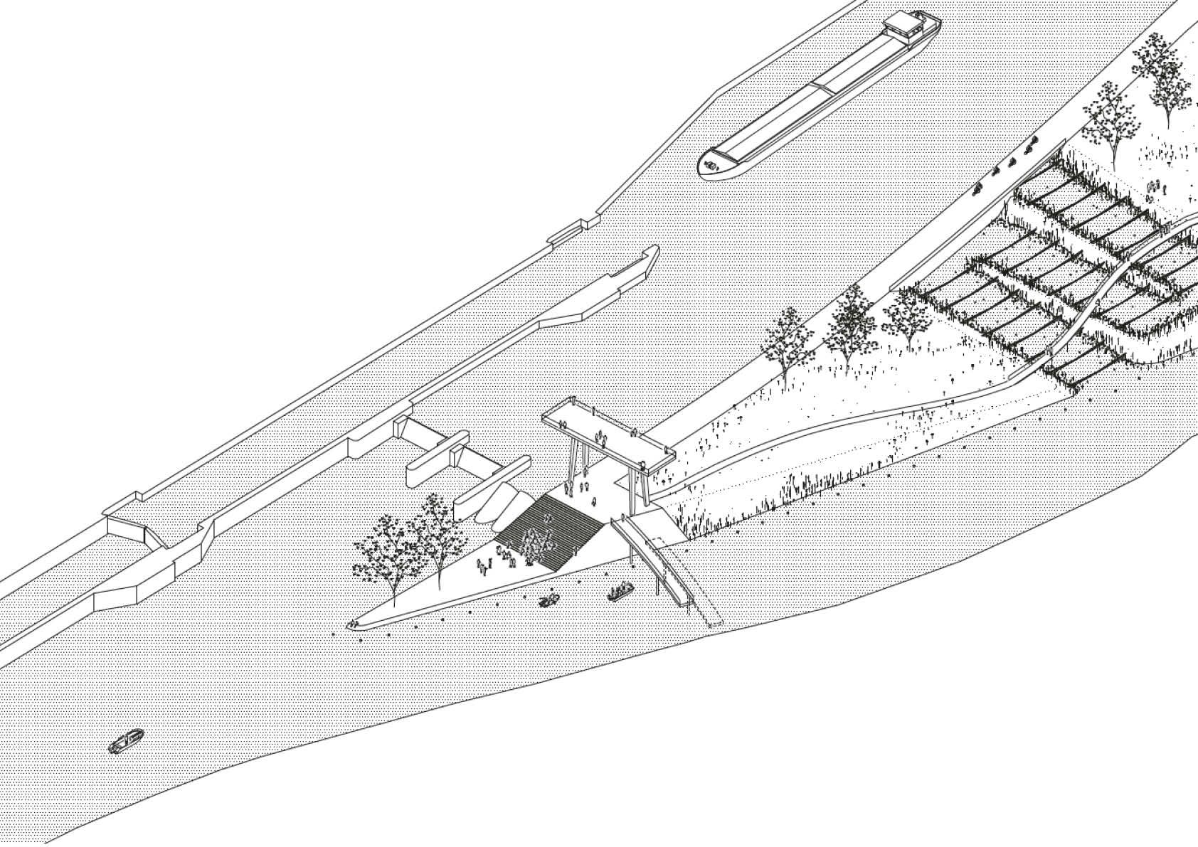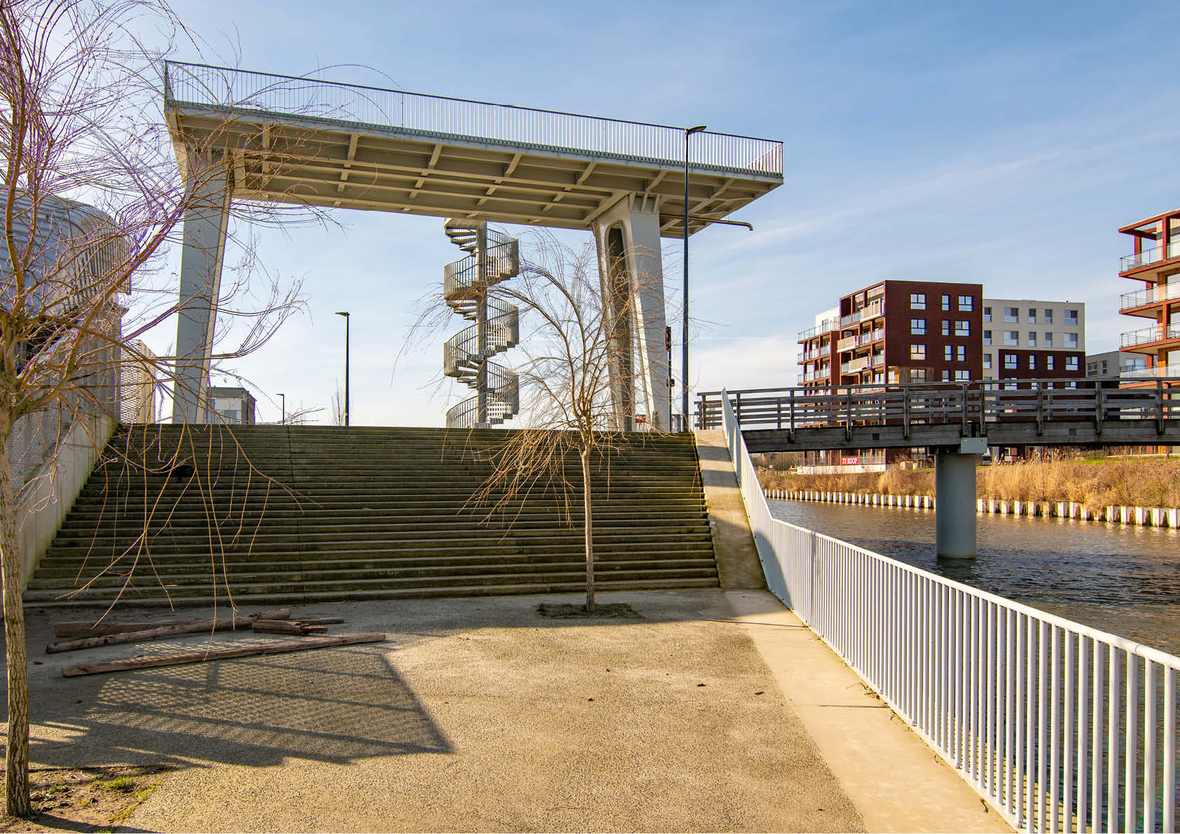 Deze grootschalige infrastructurele ingreep werd de aanleiding om dit overgebleven gebied tussen oude en nieuwe Leiearm te ontwerpen als een echt eiland. Het Moleneiland is ideaal om er als fietser of wandelaar even te pauzeren en te genieten. Op de tip van dit eiland werd uitkijkplatform geplaatst. Het is een soort monument waardoor het industrieel erfgoed een mooie plek krijgt. Harelbeke liet een oude hefportiek over de Leie ombouwen tot een uitkijkplatform. Het platform (10 x 17 m) is via een stalen draaitrap te bereiken en op 9 m hoogte kan men genieten van het uitzicht en het vernieuwde landschap.