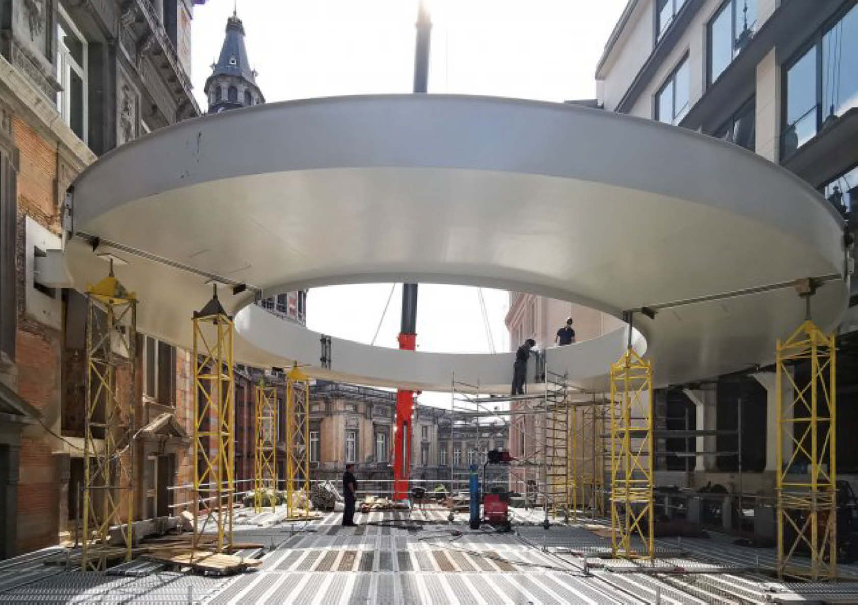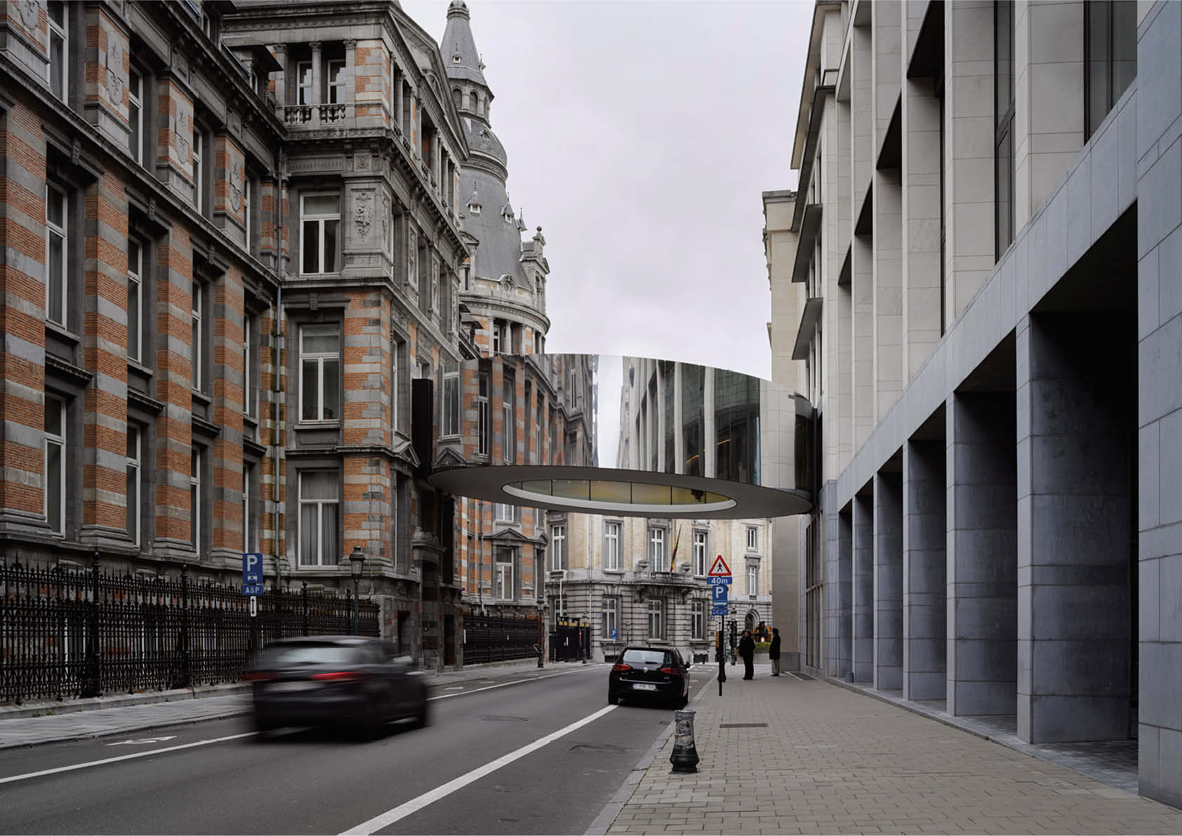 Federale parlementsleden die zich moeten verplaatsen tussen het historische Huis van de Parlementsleden in Brussel en het Forumgebouw, het nieuwe vergadercomplex aan de overkant van de straat, hoeven dat voortaan niet meer in openlucht te doen. Sinds kort kunnen ze de oversteek maken via een fraaie ringvormige passerelle met spiegelgevels. De licht hellende brug kreeg de naam ‘Tondo’, naar de ronde schilderijtjes die erg populair waren tijdens de Renaissance.